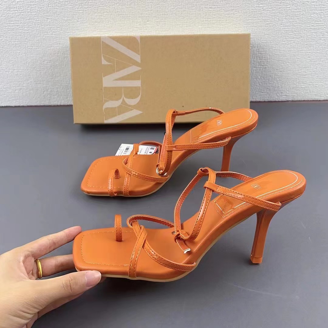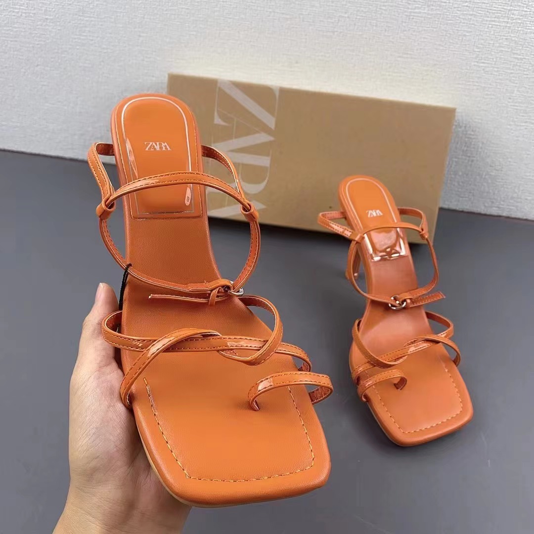ZA new high-heeled women's shoes, sheepskin leather square head, open toe, cross strap, open heel, thin heel sandals, women